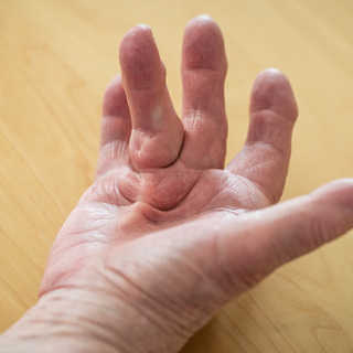 Dupuytren’s disease is a common condition that usually arises in middle age or later and is more common in men than women. Firm nodules appear in the ligaments just beneath the skin of the palm of the hand, and in some cases they extend to form cords that can prevent the finger straightening completely. The nodules and cords may be associated with small pits in the skin.